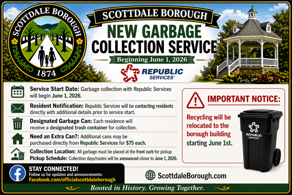 Council Meetings are held on the second Monday of each month at 6:30 pm at the Scottdale Borough building located at: 10 Mt. Pleasant Road, Scottdale, PA